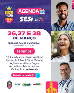 A Prefeitura de Barão de Grajaú, em parceria com o SESI, realizará nos dias 26, 27 e 28 de março o evento SESI Itinerante, trazendo diversos serviços gratuitos à comunidade. A ação acontecerá na Praça da Câmara Municipal (Antigo Mercado Velho) e oferecerá atividades voltadas para a saúde, educação e lazer.